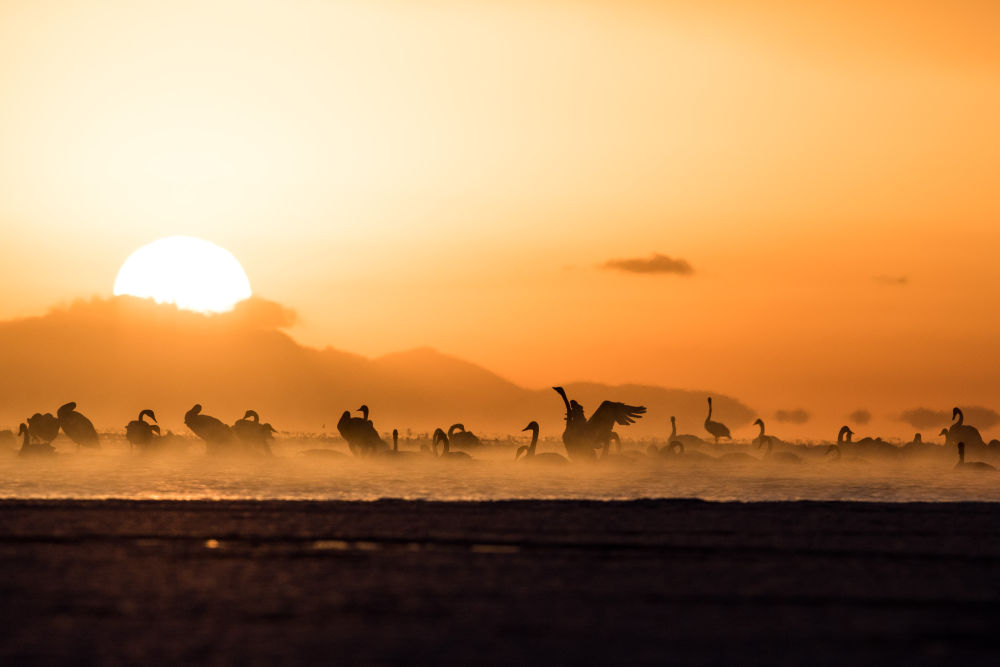 2015年12月23日,一群大天鹅沐浴在青海湖冬日的晨光中。