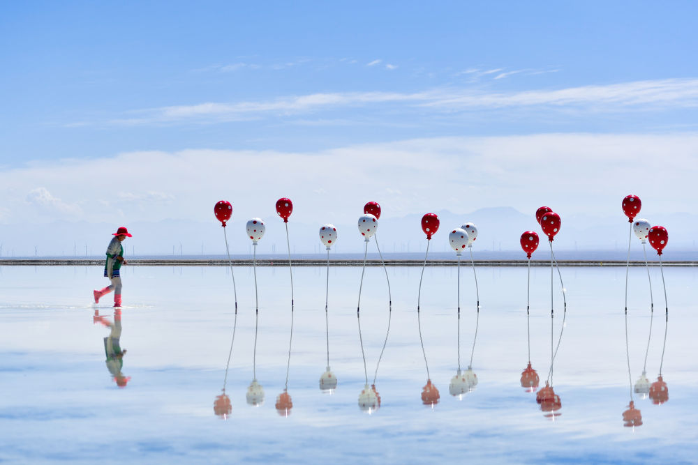 2020年9月4日,游客在青海省乌兰县茶卡盐湖“天空壹号”景区游玩。
