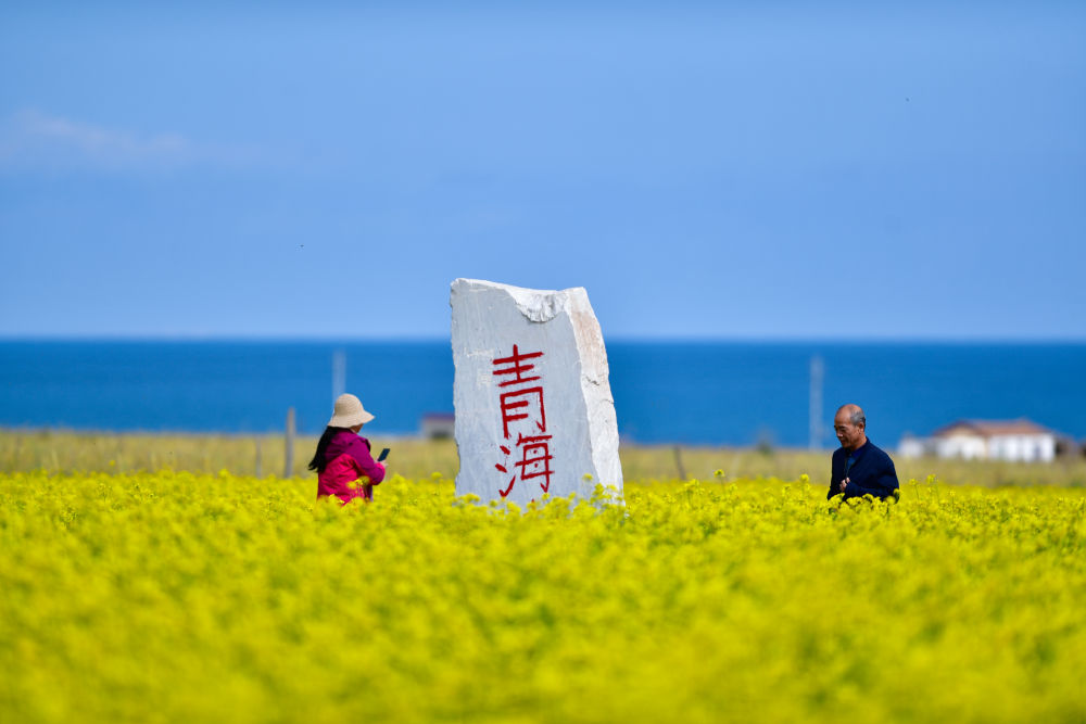 2019年9月14日,游客在青海湖畔的油菜花田里游玩。
