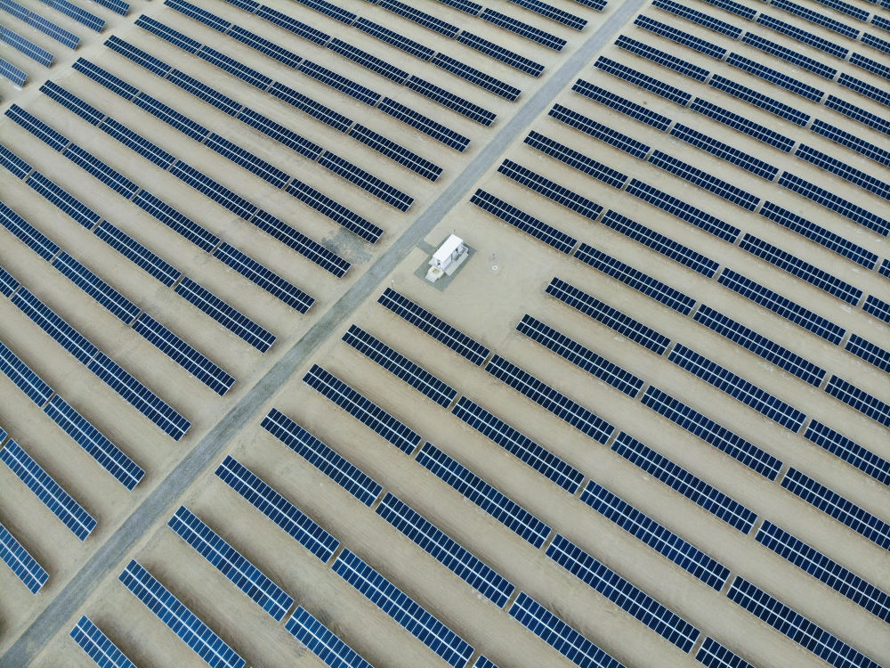 这是在青海省海西蒙古族藏族自治州格尔木市光伏产业园区拍摄的三峡新能源500兆瓦领跑者项目太阳能电池组件(2019年10月31日摄,无人机照片)。