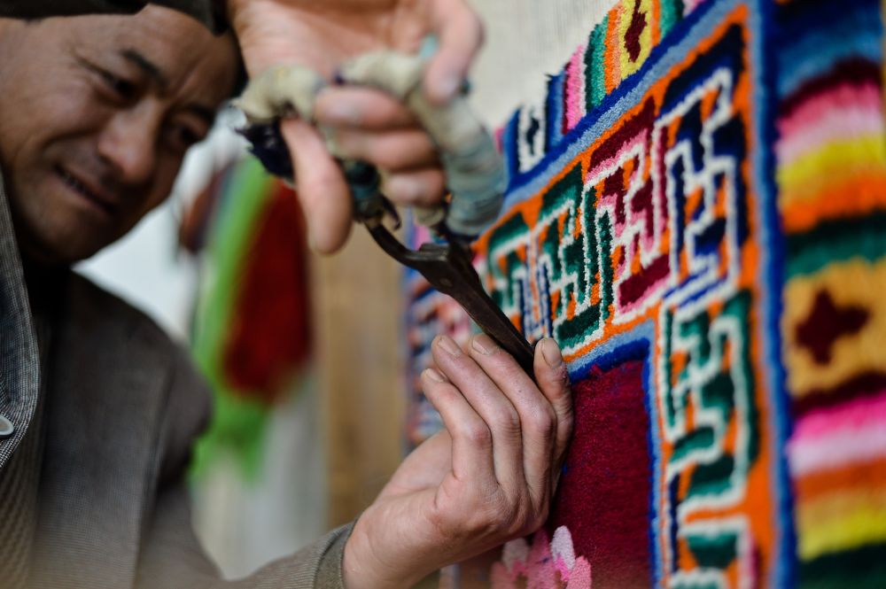 国家级非物质文化遗产项目加牙藏族织毯技艺传承人杨永良在制作藏毯(2014年9月25日摄)。