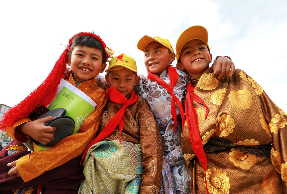 在位于青海省格尔木市郊的长江源村,几名学生在放学回家的路上合影(2018年9月30日摄)。