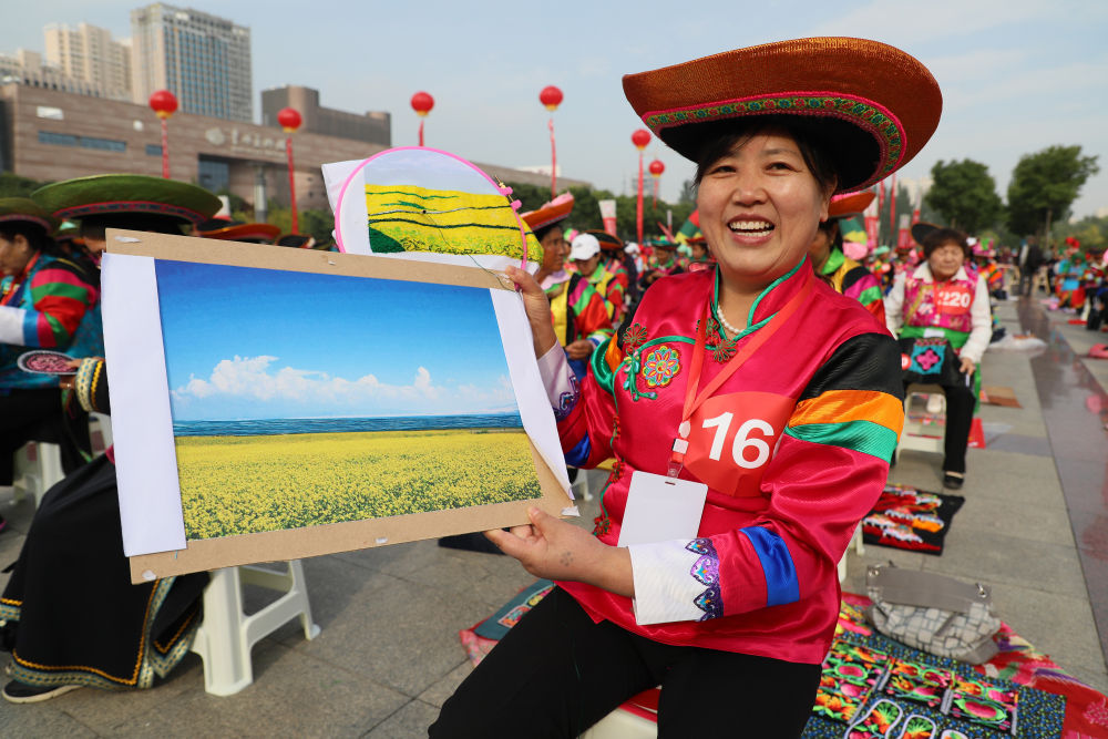 来自互助土族自治县的绣娘李延莲在展示自己的作品(2019年8月31日摄)。