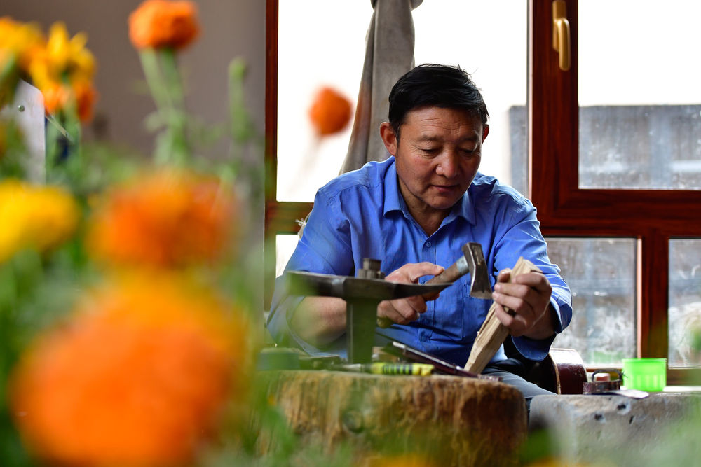 青海省玉树藏族自治州玉树市的藏刀匠人更求彭措在制作藏刀刀鞘(2019年11月17日摄)。