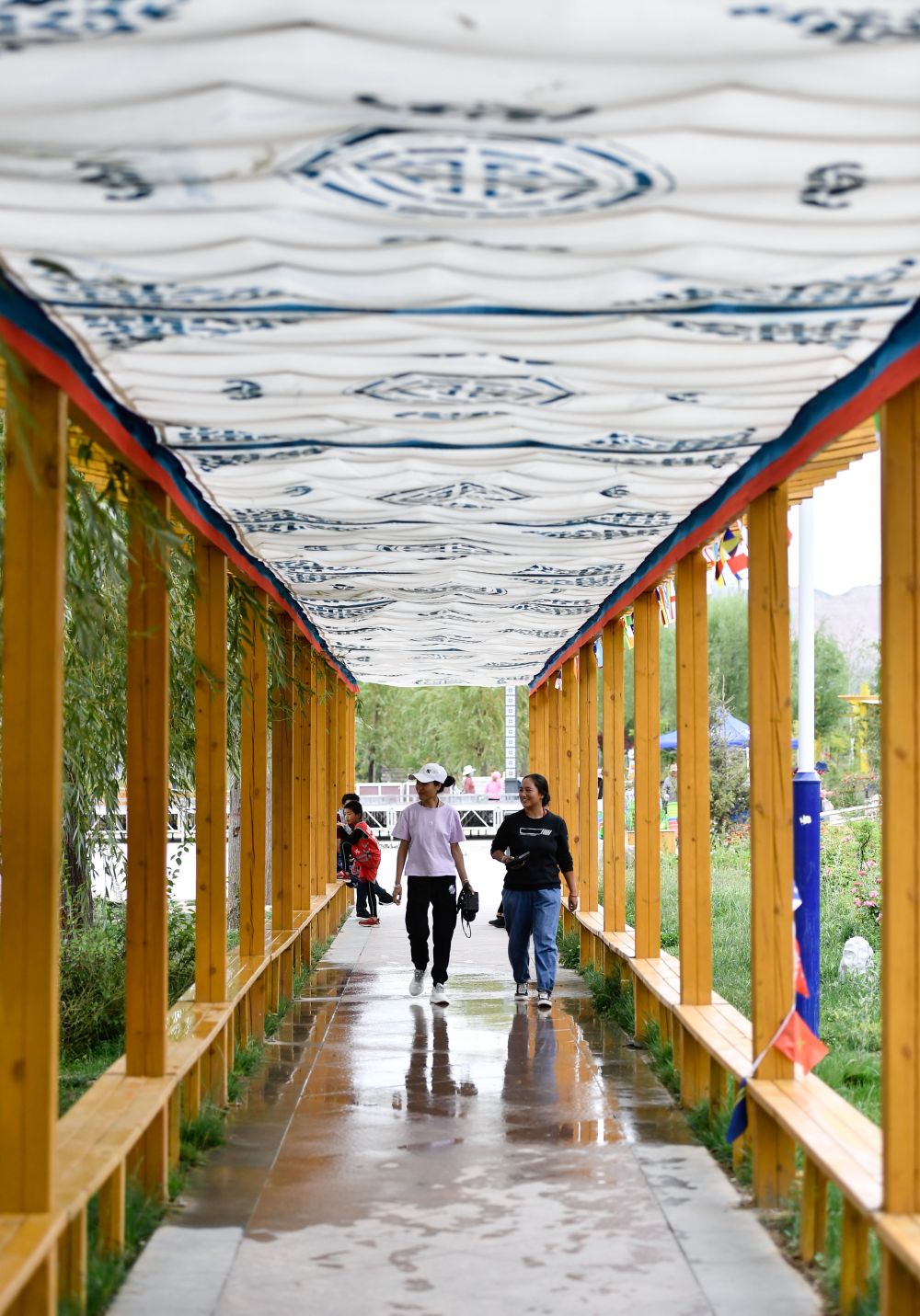 游客在青海省尖扎县昂拉乡德吉村景观长廊内游玩(2020年8月11日摄)。