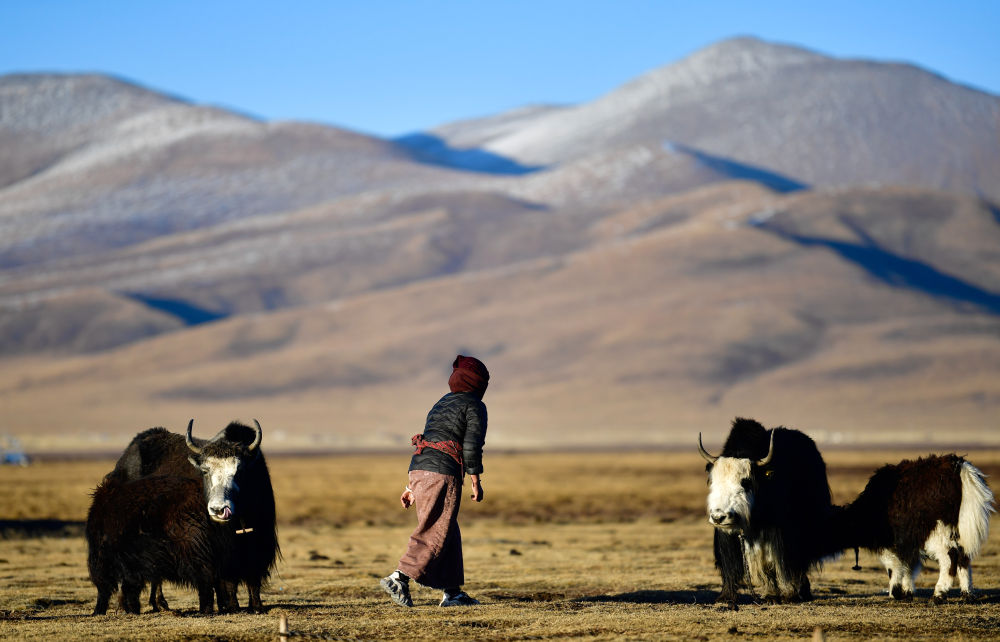 青海省玉树藏族自治州称多县珍秦镇二村牧民尼玛措毛在拴牦牛准备给牦牛挤奶(2020年10月28日摄)。