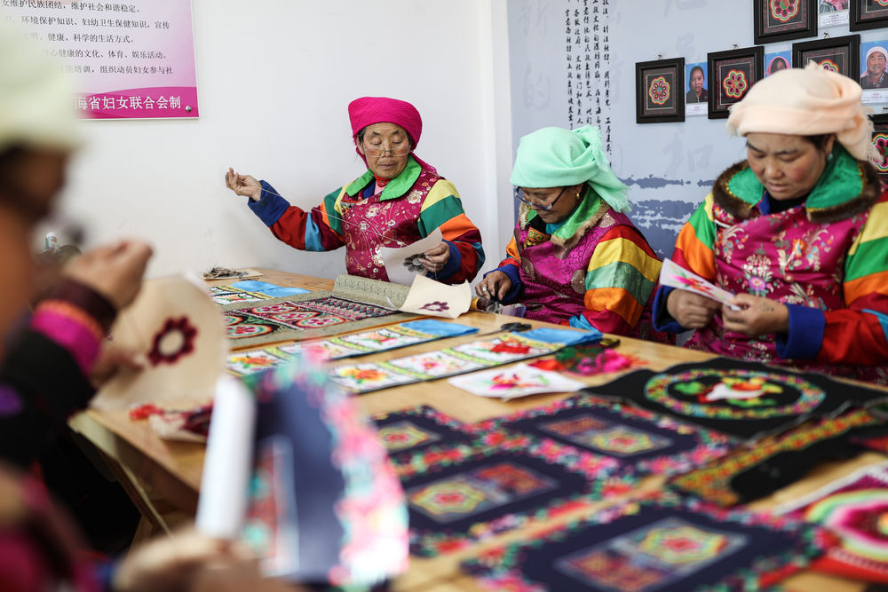 青海省海东市互助土族自治县班彦村的绣娘在村里盘绣园内制作盘绣(2020年12月31日摄)。