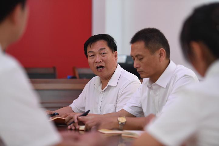 在河南省炳良电子商务有限公司党支部大会上,孙炳良(右三)正向党组织汇报思想、工作、学习情况(6月4日摄)。新华社记者张浩然摄