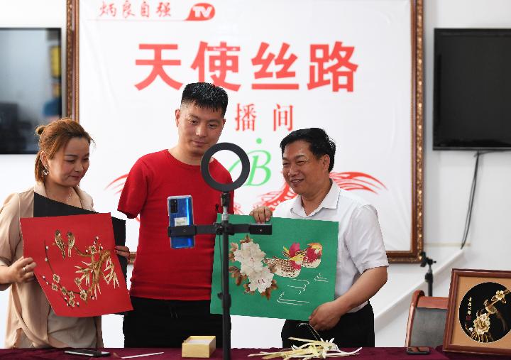 孙炳良(右一)正在公司直播间帮助销售残疾人员工自制的工艺品(6月4日摄)。新华社记者张浩然摄
