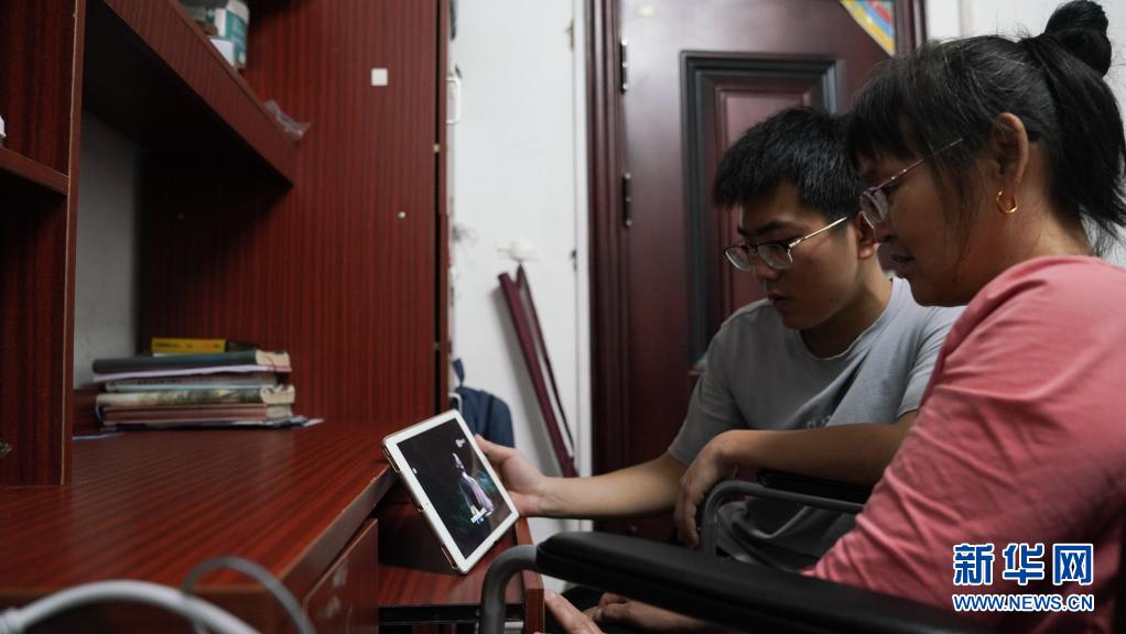 6月2日,赵建军和母亲在宿舍内用平板电脑观看电视剧。新华社记者胡晨欢摄