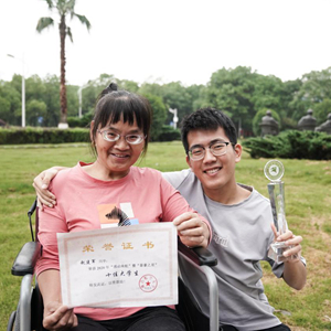 6月1日,赵建军在学校食堂内为母亲打饭。新华社记者胡晨欢摄