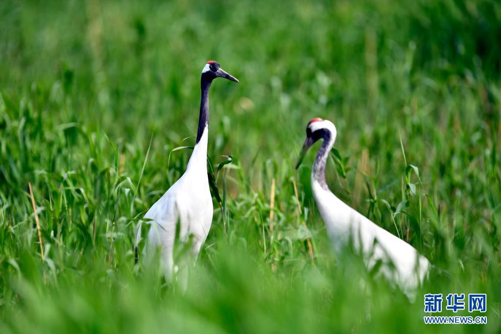 在山东黄河三角洲国家级自然保护区,两只丹顶鹤在水草间栖息(5月13日摄)。新华社记者 郭绪雷摄