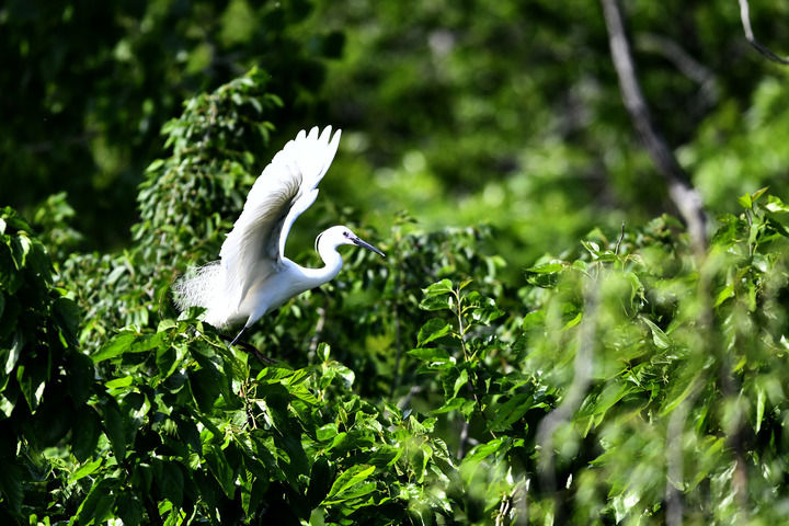 在东营市白鹭园,一只白鹭展翅飞翔(5月12日摄)。 新华社记者 郭绪雷摄