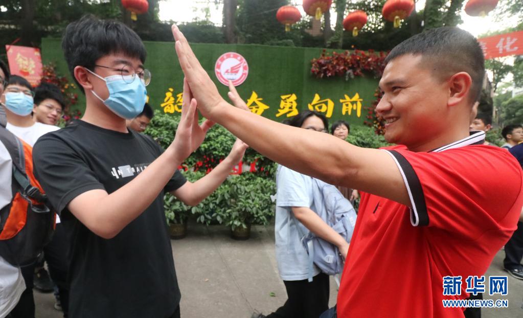 6月9日,在湖南省娄底市第二中学考点,走出考场的老大李庆国和班主任宋老师击掌。
