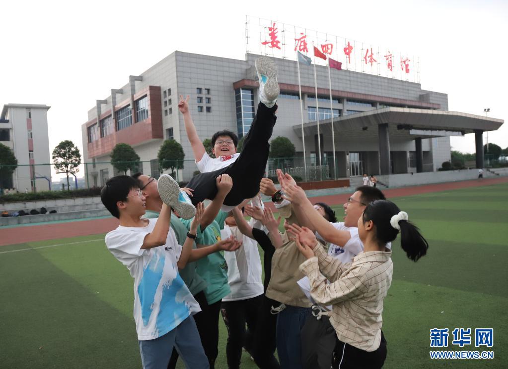 6月9日,在湖南省娄底市第四中学,老三李庆民被同学们抛向空中,庆祝顺利完成高考。
