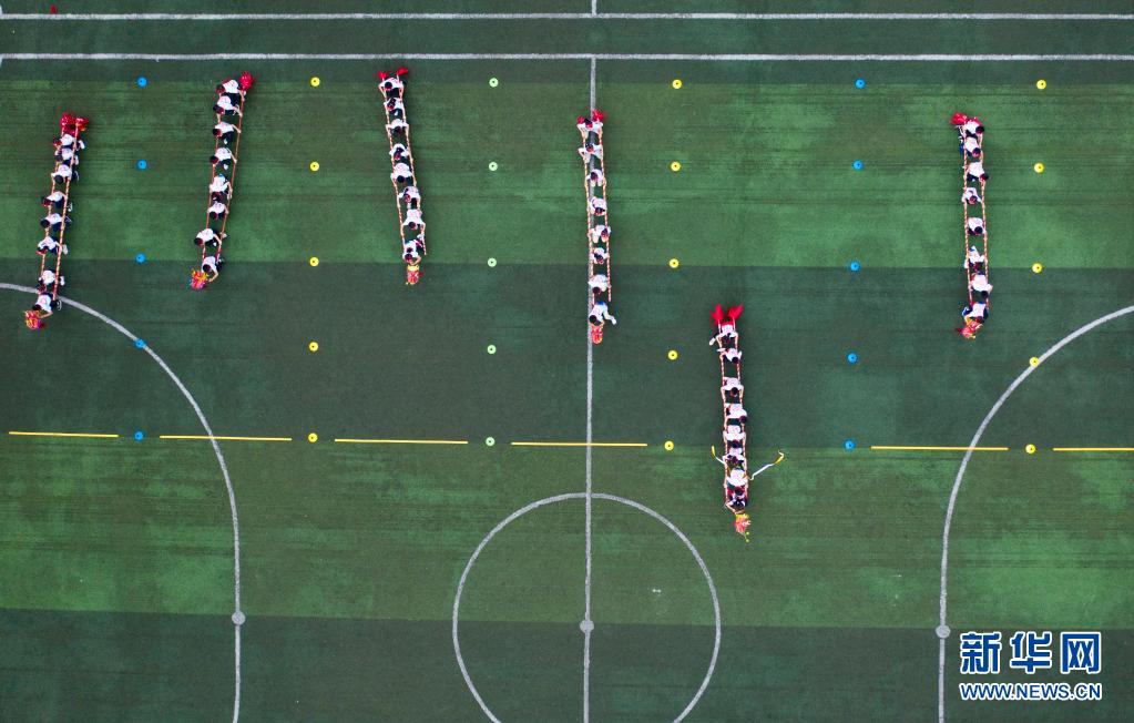 6月10日,在重庆市北碚区缙云幼儿园,孩子们在参加旱地龙舟比赛。