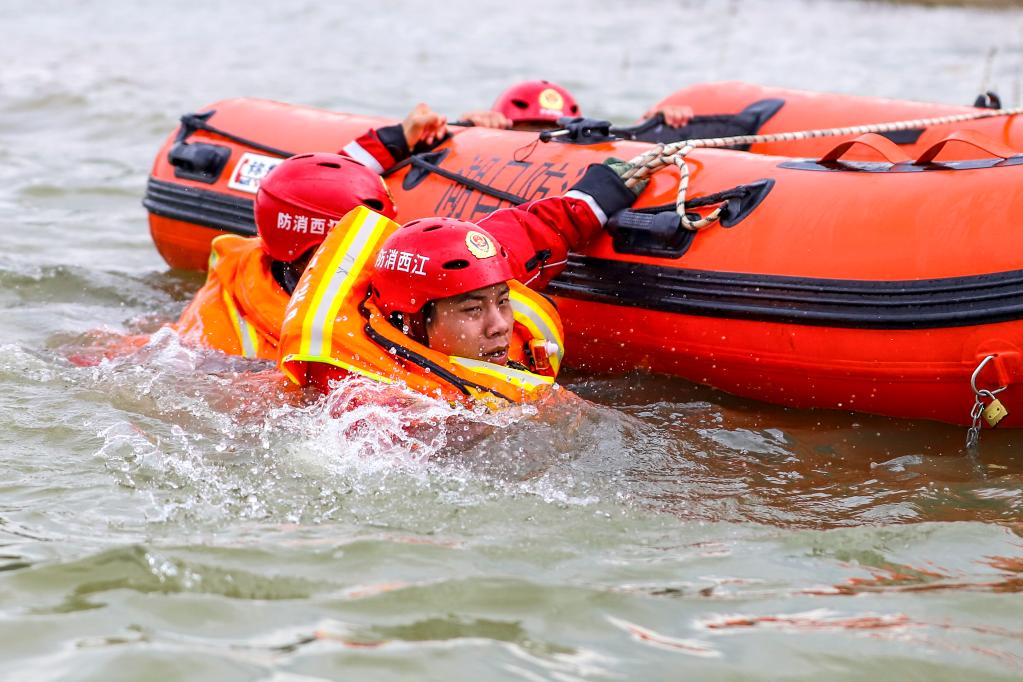 6月3日,九江市湖口县消防救援大队指战员进行“舟艇侧翻”课目的演练。新华社发(张玉 摄)