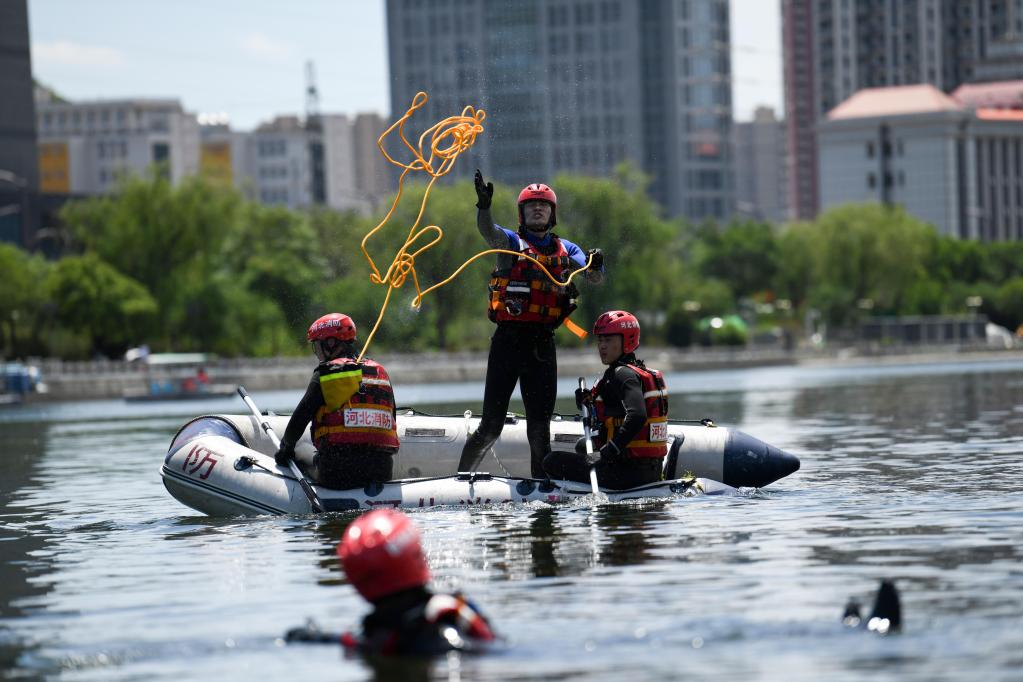 2021年6月6日,承德市消防救援支队指战员在双桥区武烈河水域进行落水人员营救演练。新华社发(王立群 摄)