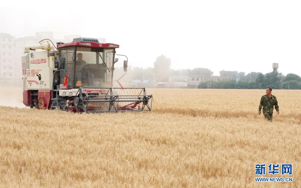 6月8日,在邢台市南和区的农作物种植基地,苏川(右)查看小麦收割情况。新华社记者 杨世尧 摄