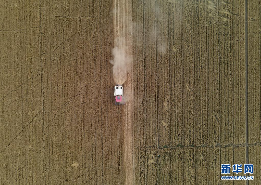 6月8日,在邢台市南和区的农作物种植基地,收割机在田间工作(无人机照片)。新华社记者 金皓原 摄