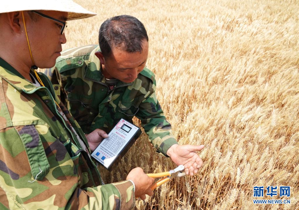 6月8日,在邢台市南和区的农作物种植基地,苏川(右)和同事测量小麦含水率。新华社记者 杨世尧 摄
