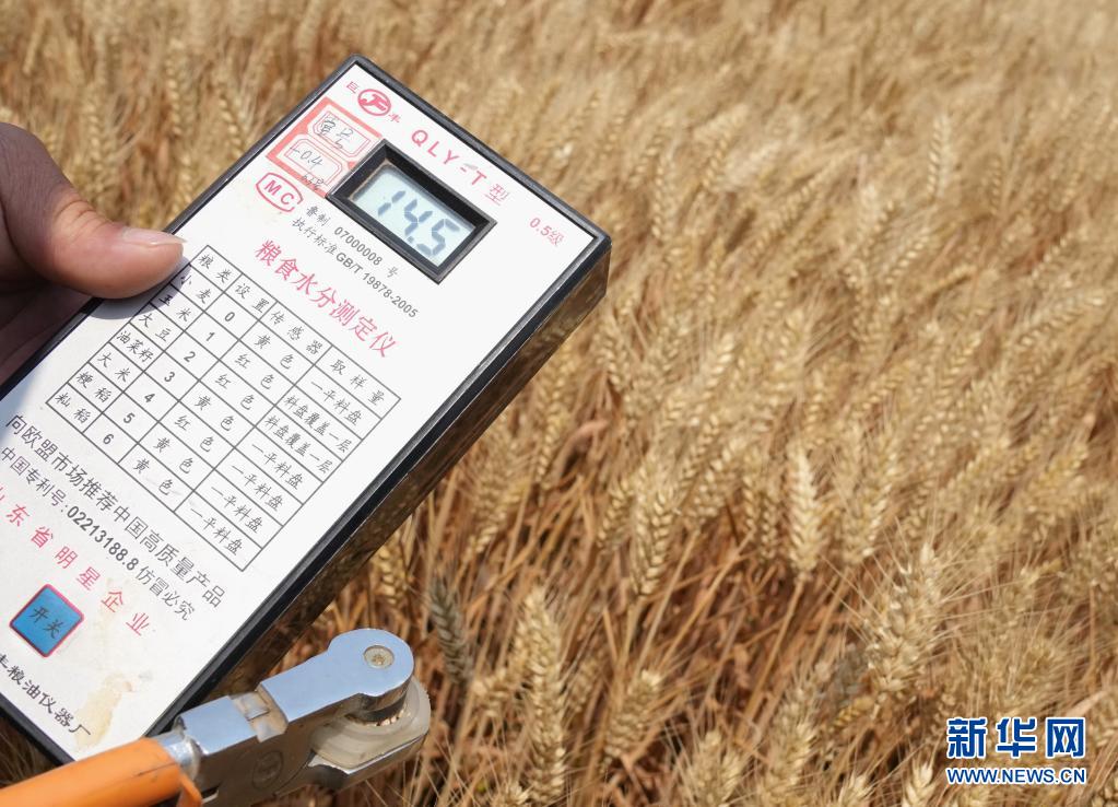 6月8日,在邢台市南和区的农作物种植基地,苏川用粮食水分测定仪测量小麦含水率。新华社记者 杨世尧 摄