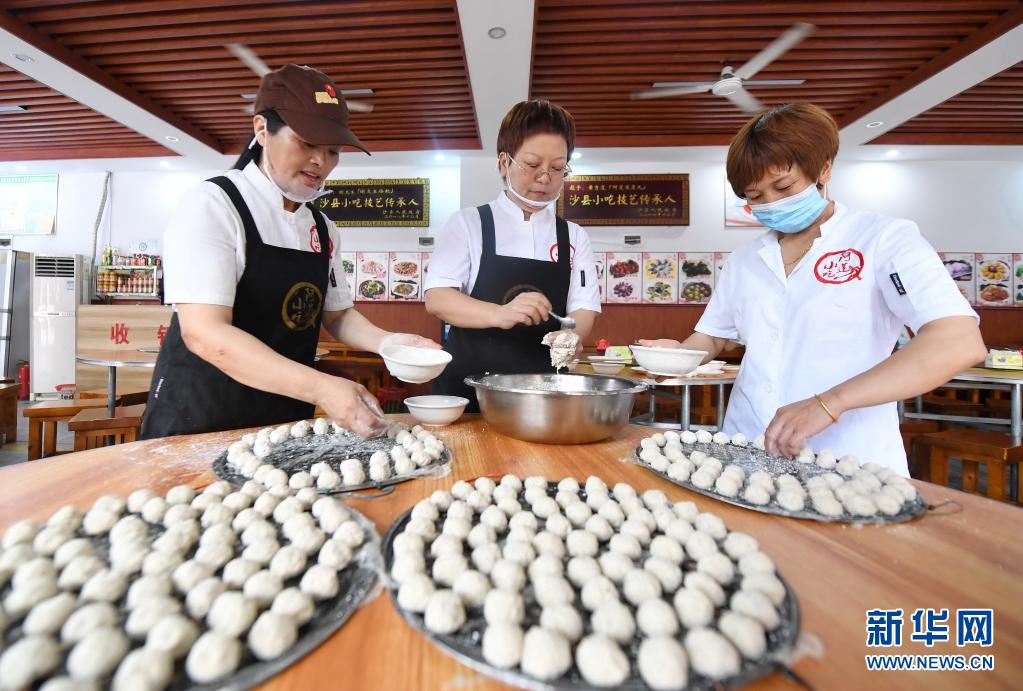 6月11日,在福建三明市沙县区,阿莲豆腐丸技艺传承人黄秀莲(中)和同事一起制作滚粉豆腐丸。