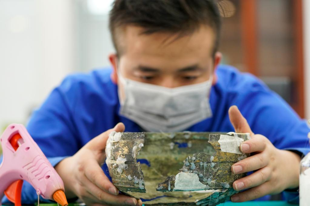 6月9日,三峡文物科技保护基地的文物修复室内,文物修复师赵晓宇在对一件汉代的青铜器进行修复。新华社记者 刘潺 摄