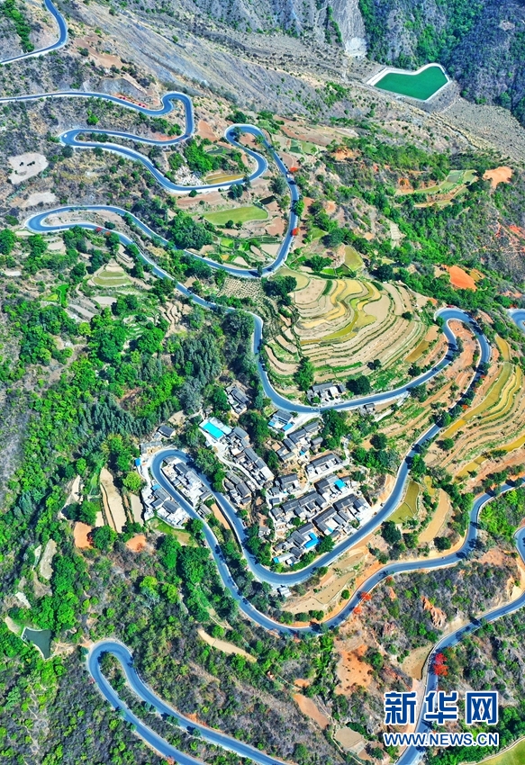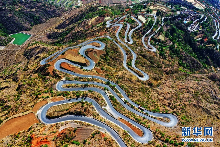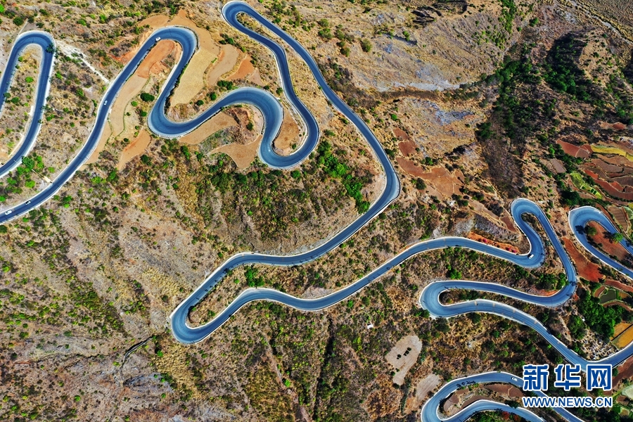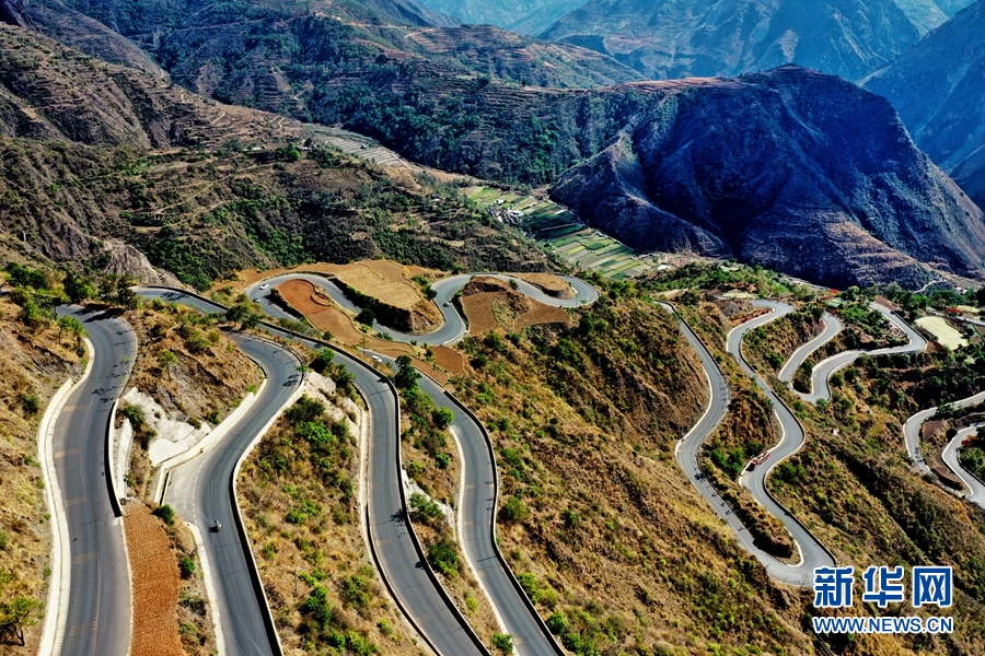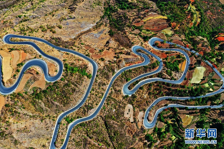 航拍视角下的绿汁镇盘山公路。新华网发(崔永江/摄)