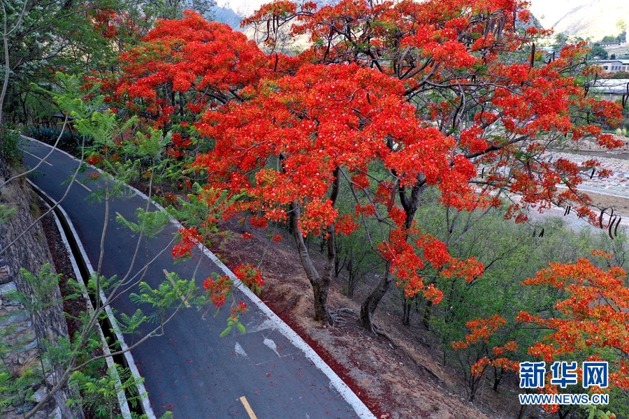 部分路段旁盛放的凤凰花。新华网发(崔永江/摄)
