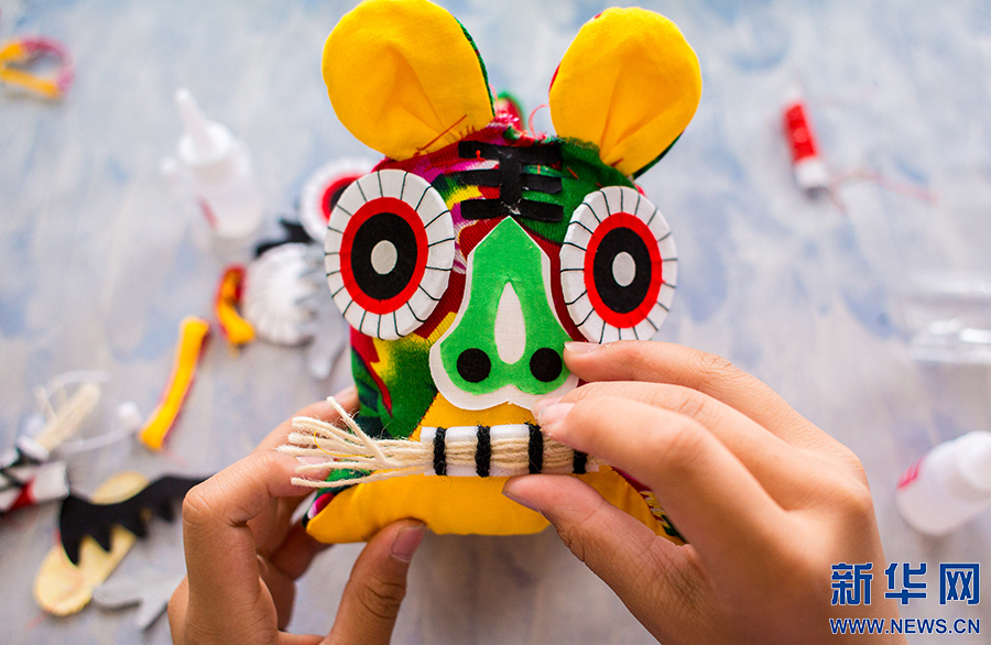 6月11日,内蒙古呼和浩特市玉泉区通顺街小学学生在制作布老虎。 新华网发(丁根厚摄)
