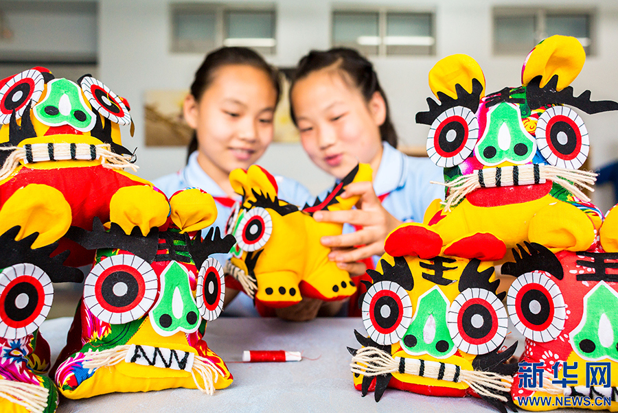 6月11日,内蒙古呼和浩特市玉泉区通顺街小学学生在制作布老虎。新华网发(丁根厚摄)