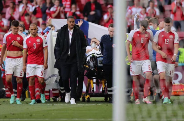丹麦队员埃里克森被医护人员带离赛场。(图片来自欧锦赛官网)