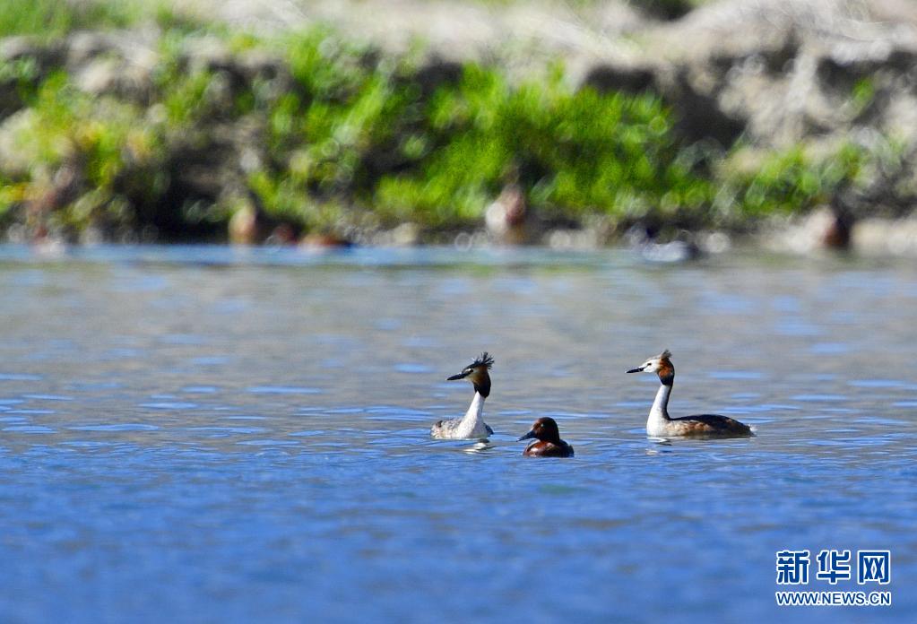 6月14日在拉鲁湿地拍摄的两只凤头䴙䴘和一只小䴙䴘(中)。夏日里,凤头䴙䴘和小䴙䴘在西藏拉萨拉鲁湿地国家级自然保护区水面上嬉戏。新华社记者 张汝锋 摄