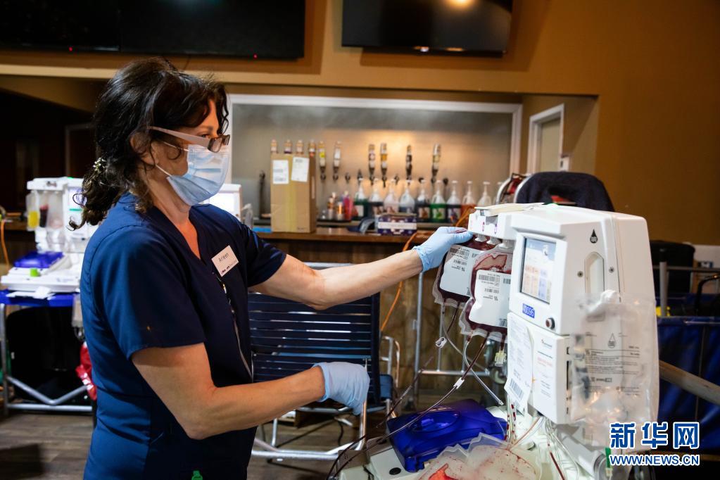 6月14日,在美国纽约州长岛地区的贝肖尔,工作人员在美国纽约血液中心举行的献血活动上处理采集的血液。