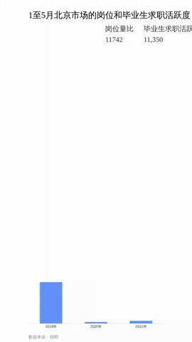 柱状图:2021年1至5月北京市场的岗位供给比去年同期增长78.19%,比2019年同期增长了51.74%。