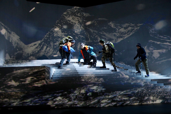舞台上,话剧《种子天堂》剧情进入最高潮——在缺氧、强风恶劣环境下,钟扬拼尽气力来到海拔6000米的高度。当他终于在一堆杂草和冰雪中发现那株顽强的雪莲时,就像父亲看到自己刚出生的婴儿,脸上挂着深深的喜悦,凝望良久……