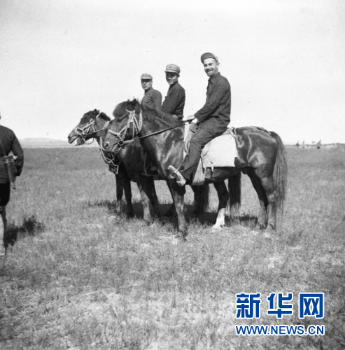 这是1936年,斯诺(右一)在陕北采访途中(资料照片)。新华社发
