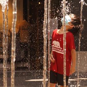 6月16日,美国加利福尼亚州洛杉矶市民在喷泉旁戏水纳凉。加州南部本周迎来今年的首次高温天气。