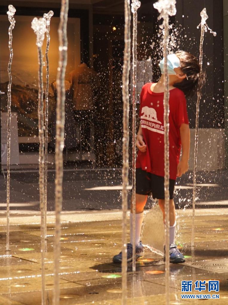 6月16日,美国加利福尼亚州洛杉矶市民在喷泉中戏水纳凉。加州南部本周迎来今年的首次高温天气。
