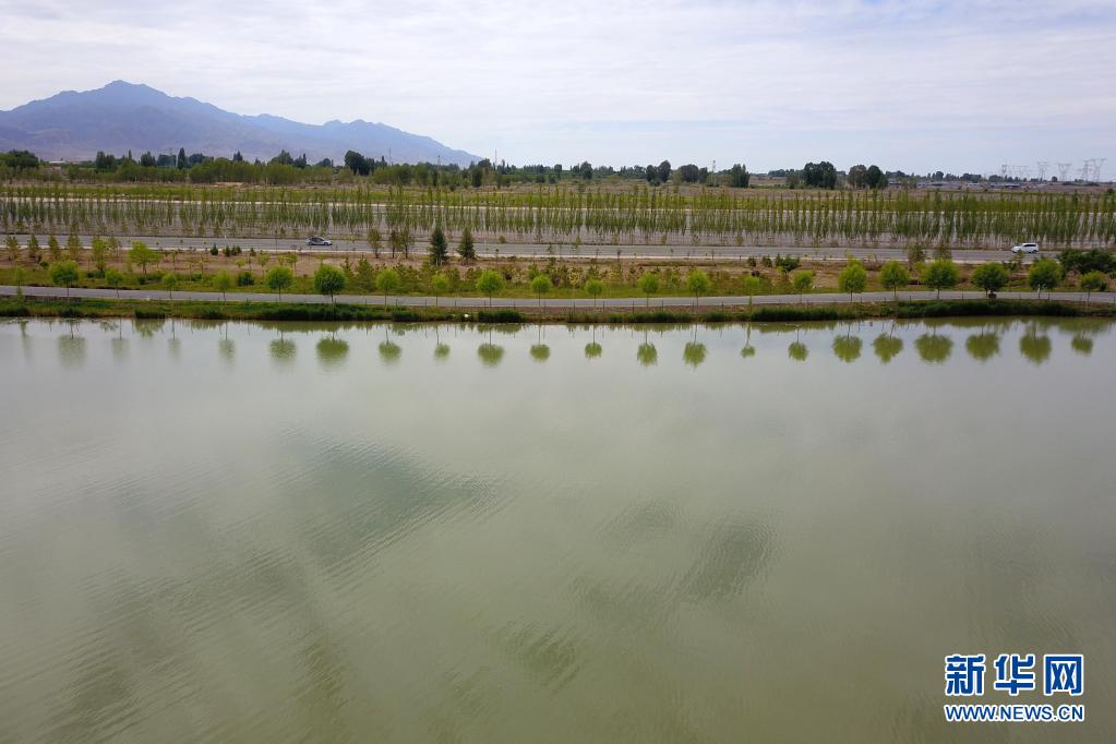 这是6月16日在临泽县拍摄的水系连通项目中打通的梨园河东河水系(无人机照片)。