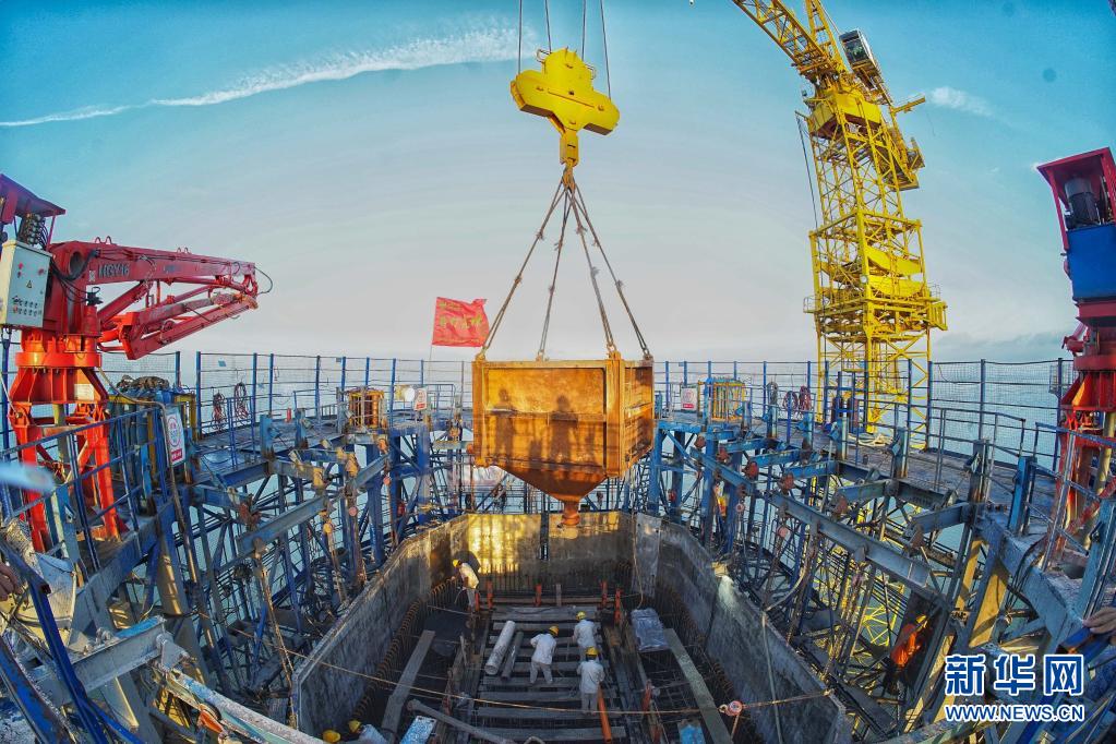 工人在深中通道伶仃洋大桥东索塔进行浇筑混凝土施工(6月16日摄)。新华社发(张政 摄)