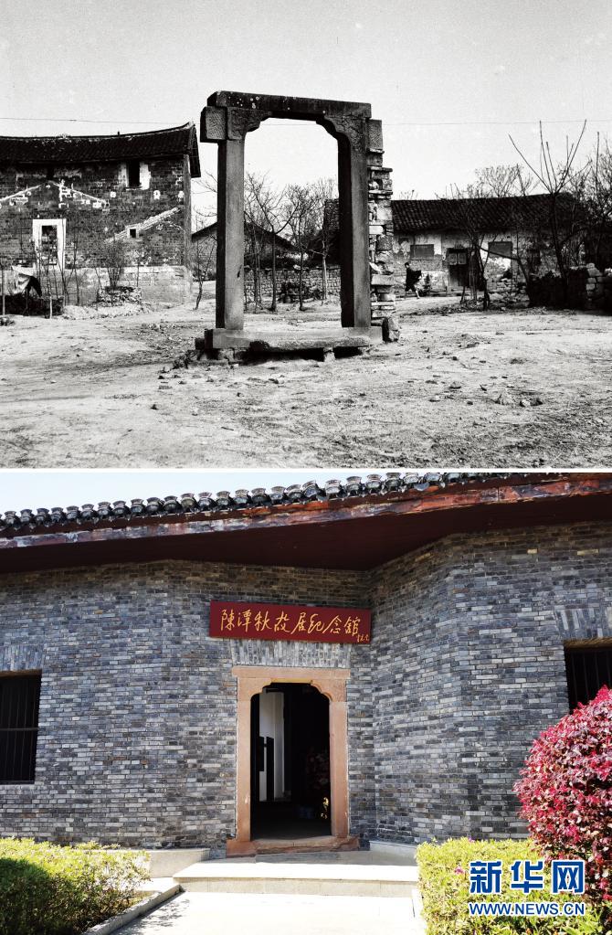 拼版照片:上图为1927年,反动派烧毁陈潭秋黄冈老家的房子,仅留下一个石门框(资料照片);下图为湖北黄冈陈潭秋故居纪念馆(2021年摄)。新华社发