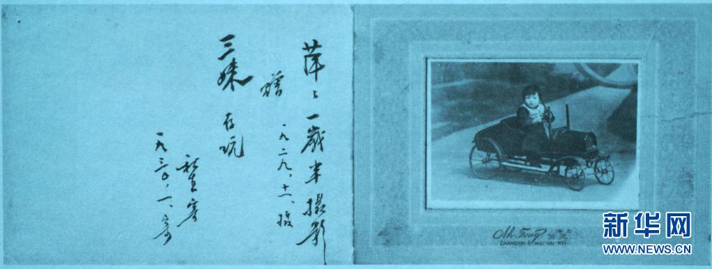 陈鹄儿时照片,上面有陈潭秋的亲笔题字(翻拍资料照片)。新华社发
