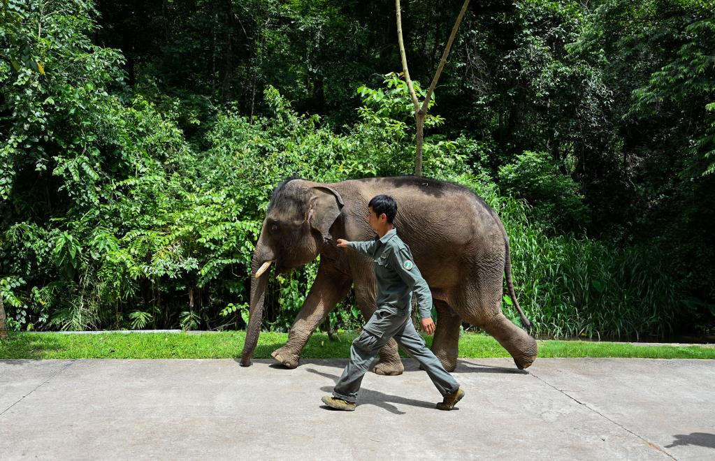 6月17日,“象爸爸”牵着一头亚洲象外出活动。新华社记者王冠森摄
