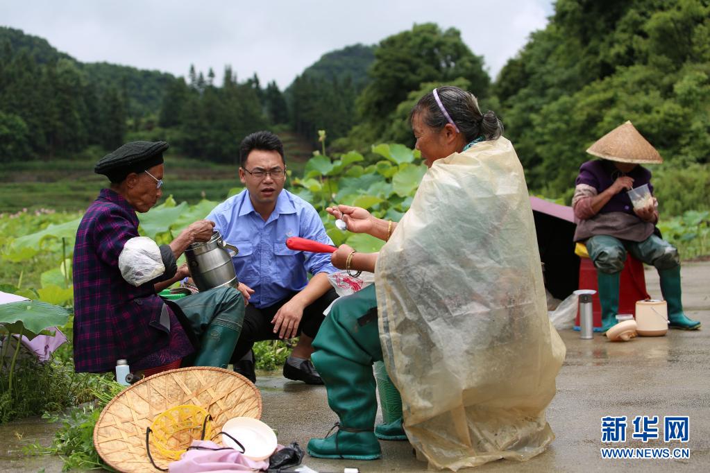 贵州省普定县化处镇水井村驻村第一书记王泽勇(左二)在藕田边和村民们交流(2019年6月18日摄)。新华社发
