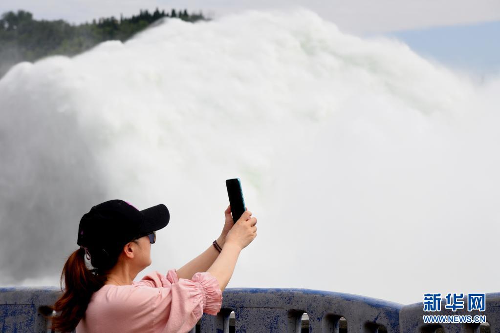 6月19日,游客在黄河小浪底水利枢纽工程出水口观看调水调沙场景。新华社发(苗秋闹摄)