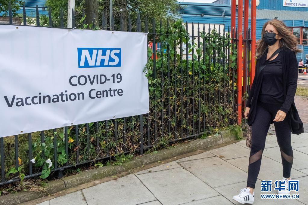 6月19日,一名女子从英国伦敦一家新冠疫苗接种中心外走过。