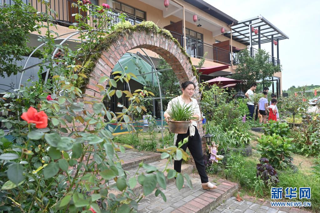 6月19日,在建宁县溪口镇高圳村春花农场,农场主人、当地村民陈春花在打理民宿前的盆景。