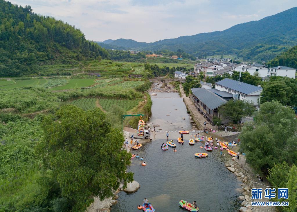 6月19日,在建宁县濉溪镇高峰村香溪花谷,游客在河里感受夏日清凉(无人机照片)。